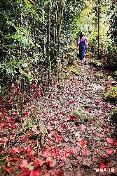 從稍來步道瞭望台繼續往鳶嘴山走,滿地紅葉迎接遊客。